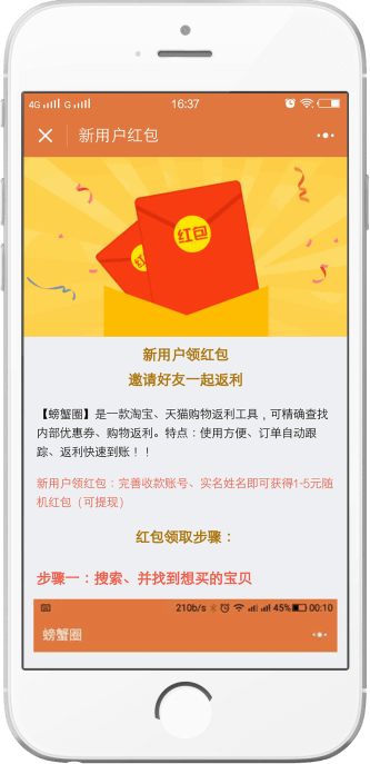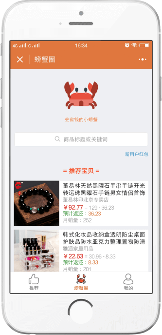 《 螃蟹圈》小程序是一款購物小工具,幫助購物族方便快捷的查詢商品優惠券、購物獲返利的省錢利器。