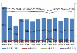 中國信息通信研究院今日發布《2017年12月國內手機市場運行分析報告》。數據顯示,2017年12月,4G手機出貨量4041.2萬部,上市新機型57款。