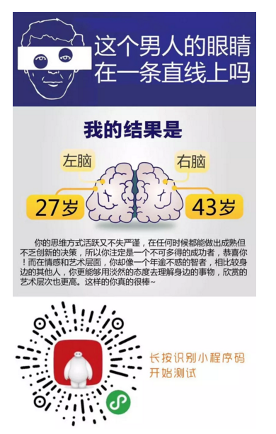 不少人紛紛把這張含有小程序碼的測試結果分享到朋友圈,讓 “實用心理測試大全”成了繼“匿名聊聊”之后的又一款現象級刷屏小程序。