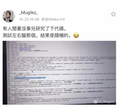 不過,正當大家被各種測試結果刷屏,玩得不亦樂乎之時,廣州企業網站建設公司有人研究了代碼后指出:這個測試根本不靠譜!所有的結果圖片都是現成的,無論你做出什么選擇,最后得到的測試結果都是隨機的。