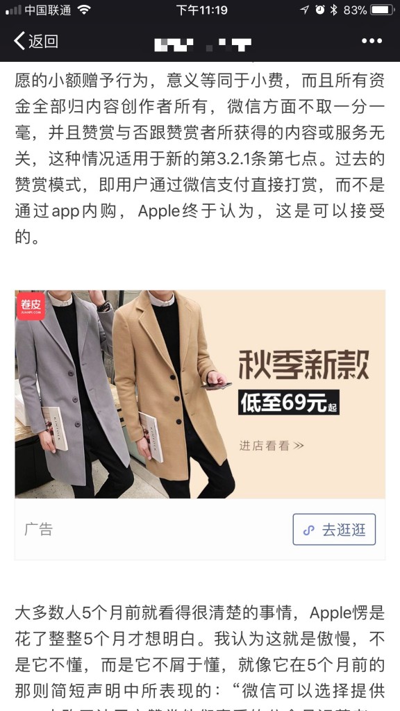 1、文中廣告的落地頁面限制為小程序,而底部廣告是跳轉到關注頁或者文章頁;