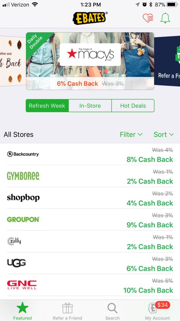 Ebates 這款APP 就使用了兩級菜單的設計,首先最常用的導航選項被做成標簽頁置于頁面頂部,另外一個就是右上角的書簽式菜單(心型+漢堡圖標)。整個設計確保了功能性,足夠簡單,不會讓用戶覺得復雜,也可以輕松找到他們想要的東西。