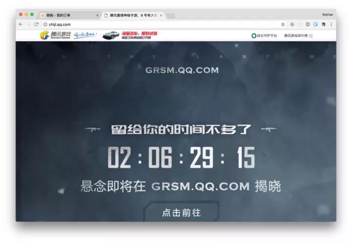 目前,該域名會引導用戶到 grsm.qq.com(域名意義疑似「光榮使命」),頁面中的二維碼是名為「騰訊重磅手游 8 日見」的公眾號。