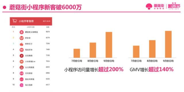 關于微信小程序,蘑菇街副總裁范懿銘宣布了幾個數據:訪問量從 7 月份到 9 月份,增長超過了200%,GMV增長超過了140%,不到 3 個月的時間有 6000 萬的訪問客戶和 1000 萬的新購用戶。