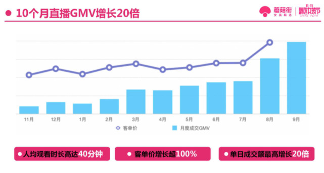 據蘑菇街官方公布數據顯示,自 2016 年 3 月,蘑菇街發力“直播+電商”上線直播業務后,其月成交額以超過100%的速度增長。從 2016 年至 2017 年 9 月,人均觀看時長為 40 分鐘,客單價增長是100%,單日成交量超 20 倍。廣州微信小程序開發
