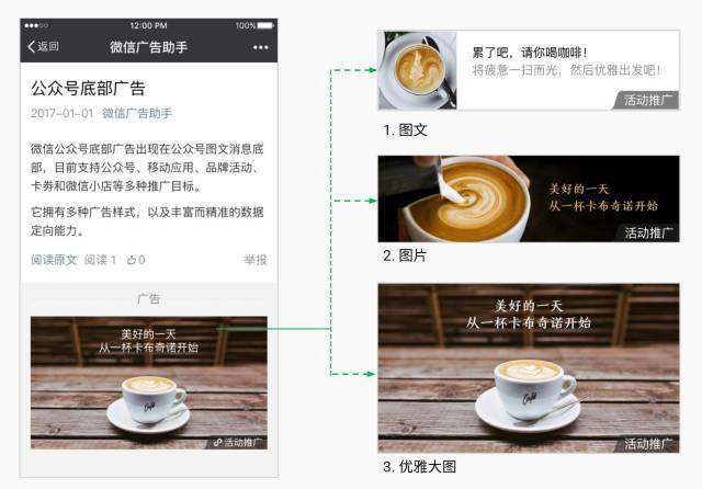 此后,公眾號底部廣告位將根據廣告主投放需求,以圖文、圖片或優雅大圖的形式,顯示小程序廣告,用戶點擊廣告可直接跳轉至相應小程序。(目前電商推廣暫只支持圖片形式)