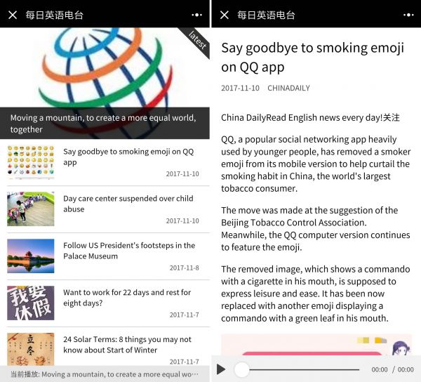 “每日英語電臺”是ChinaDaily和微軟亞洲研究院聯合推出的小程序,提供英語閱讀及聽力功能。榜妹使用了幾次發現,目前離開小程序收聽的功能不穩定,有點不方便。