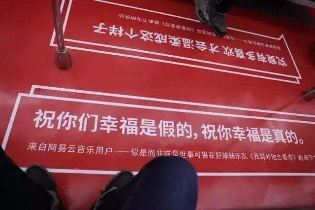 整個(gè)車廂被貼上了扎眼的大紅色貼紙,無(wú)論是周圍的扶手,還是腳下踩著的地方,全部被滿滿覆蓋了紅色的廣告。
