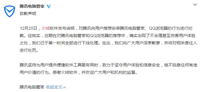 騰訊電腦管家:向火絨軟件致歉 已全部下線