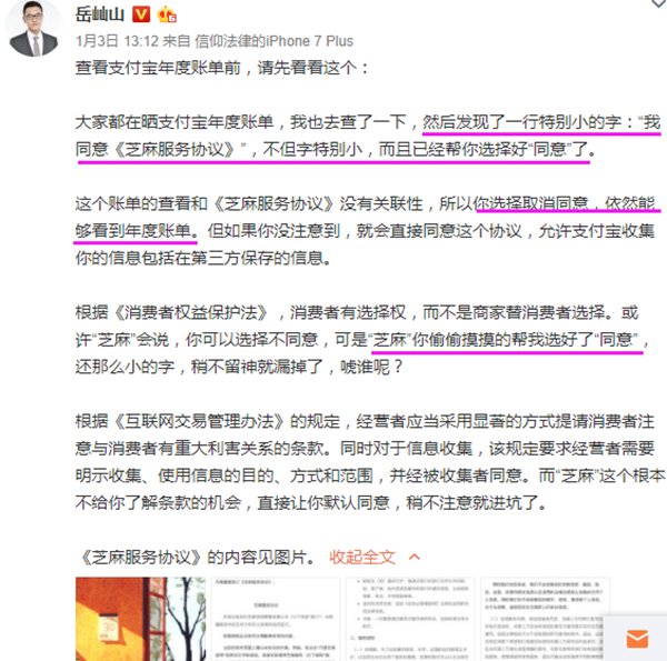 相信大家已經(jīng)知道了事情的整個(gè)過程。1月3日,微信朋友圈被支付寶的2017年度賬單和2018年度關(guān)鍵詞刷屏,當(dāng)大家正沉浸其中時(shí),微博認(rèn)證為“岳成律師事務(wù)所合伙人,央視法律專家”的岳屾山發(fā)了條微博,指出這次曬單活動(dòng)中存在的一些問題——