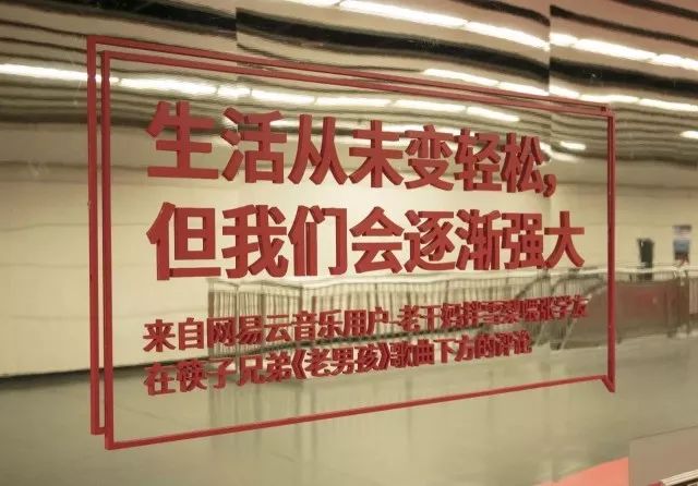 網易云的地鐵廣告又來了,趕在新年前,他們在北京的團結湖地鐵站,布置了一條“鏡面長廊”,上面用紅色的字體寫上了APP評論區中的“扎心”歌詞,希望路過的人能夠在即將到來的一年,“照見自己,照見希望”。