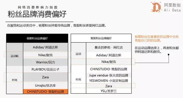 從粉絲背后的消費偏好上,有著雷同的結論:楊冪所代表的粉絲他們在購物喜好上也更偏好大眾消費品牌;而雪梨的粉絲則更聚焦在網絡品牌上。