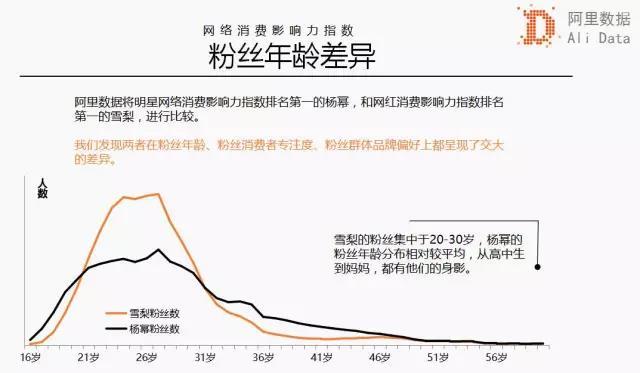 在通過比較粉絲年齡差異后發現,網紅雪梨粉絲年齡段更聚焦在20- 30 歲人群,而楊冪的粉絲年齡分布則更為發散。也就是說,作為影視紅人的楊冪在人氣覆蓋上具有更廣泛的大眾基礎。