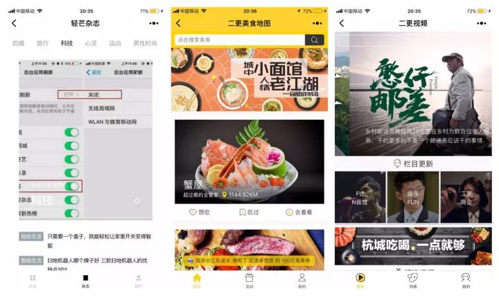 同樣是內容為主,「二更」的思路則是更看好小程序未來對本地生活服務的價值。目前「二更」有三個小程序產品: