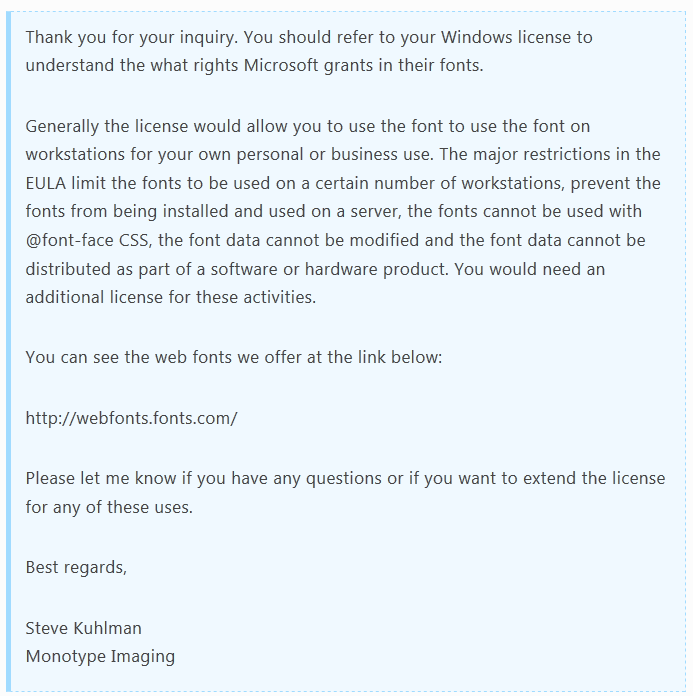 總結一下:由于用微軟雅黑顯示CSS中規定的字體,是客戶端顯示的事情,是微軟授權過的,所以就不需要再次授權了?。?/span>